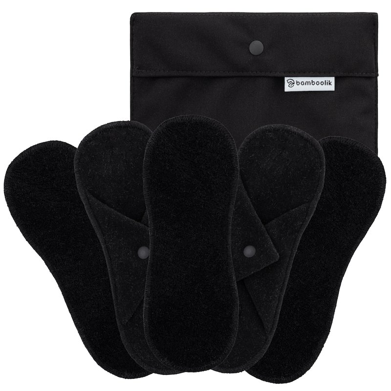 Bamboolik Výhodné sady | Slipové vložky látkové | biobavlněné froté Barva: Černá, Varianta: Sada 5 ks - Na patentek + Pytlík mini černý