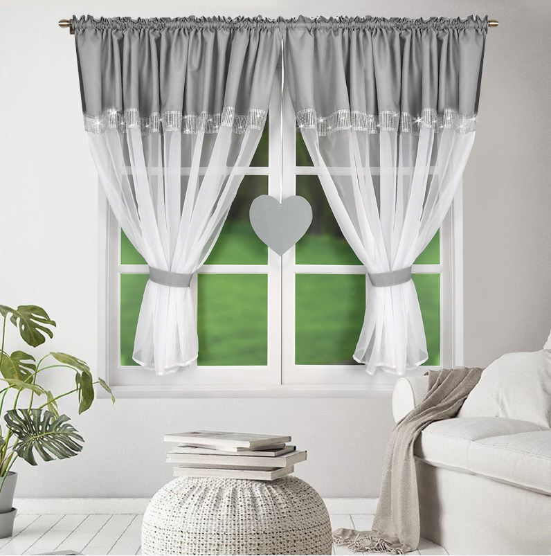 Dizajn záclony dopĺňa dekoratívny 6 cm široký pás z imitácie zirkónov na prednej strane, ktorý pôsobí veľmi efektne a pridáva priestoru nádych luxusu a jemného lesku. Súčasťou balenia je aj roztomilé srdiečko na zavesenie, ktoré umocní útulnú atmosféru vášho domova.