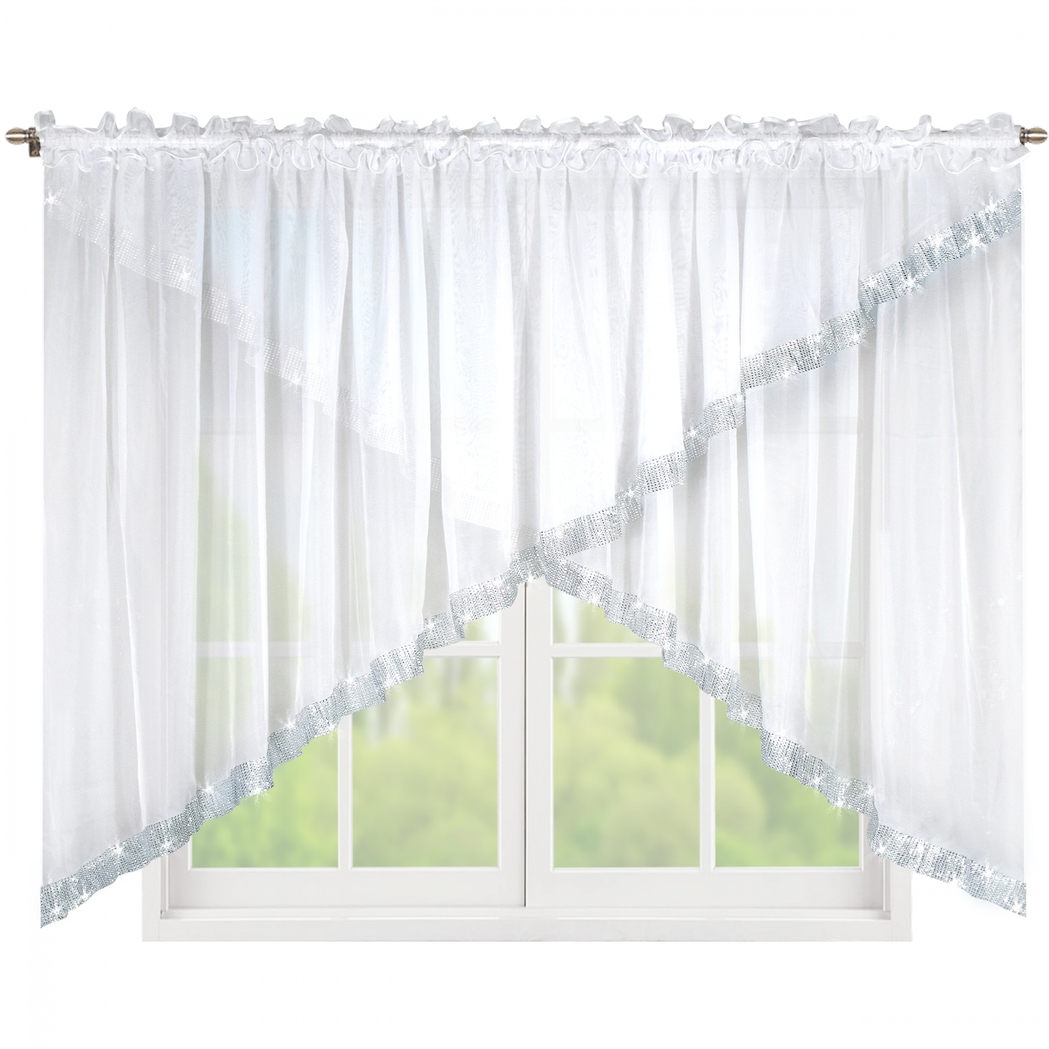 Vyberte si krátku záclonu BRIGITTE a prineste do svojho domova ľahkosť, sviežosť a nádych luxusu vďaka elegantnému zdobeniu imitáciou zirkónov. Perfektná voľba pre tých, ktorí chcú dodať oknám osobitý štýl a zároveň zachovať dostatok denného svetla.