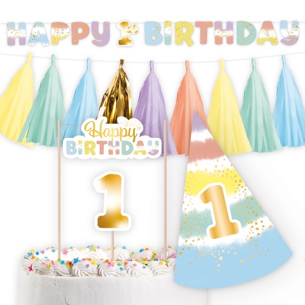 Party set Rainbow - 1st Birthday - která Vám pomůže docílit perfektní dojem z celé oslavy. Sada obsahuje 4 prvky  nezbytných pro 1 . oslavu Vašeho drobátka jako je party čepička, dekorace na dort, závěsná dekorace se střapci a nápis Happy Birthday k zavěšení.  Balení: 4 ks. prečítať celé