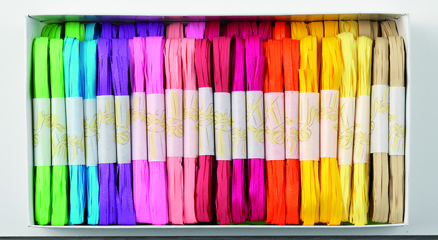 Barevné smotky matné syntetické rafie. Box obsahuje 50 smotků po pěti kusech v odstínech 02-žlutá, 05-světle růžová, 06-světle modrá, 10-světle zelená, 12-oranžová, 13-cyklámenová, 15-růžová, 40-přírodní, 24-světle žlutá. prečítať celé