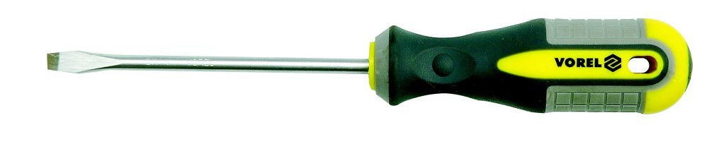 Plochý šroubovák 3x100 mm. Vyrobeno z chrom-vanadiové CrV oceli. Špička má saténový povrch, dodatečně pískovaná a magnetizovaná, což umožňuje pevné uchopení hlavy šroubu. Rukojeť je vyrobena ze dvou kompozitního plastu. Otvor v rukojeti umožňuje zavěsit šroubovák.rozměr (mm)3 x 100