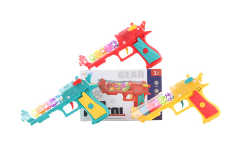Pistole po zmačknutí spuště svítí, vydává zvuky střelby a točí se ozubená kolečka. Napájení na 2 AA baterie, které nejsou součástí balení. Materiál plast. Baleno v krabici. Rozměry balení cca 19,5x12x4,5 cm. Velikost pistole cca 20 cm. Věk 3+ prečítať celé