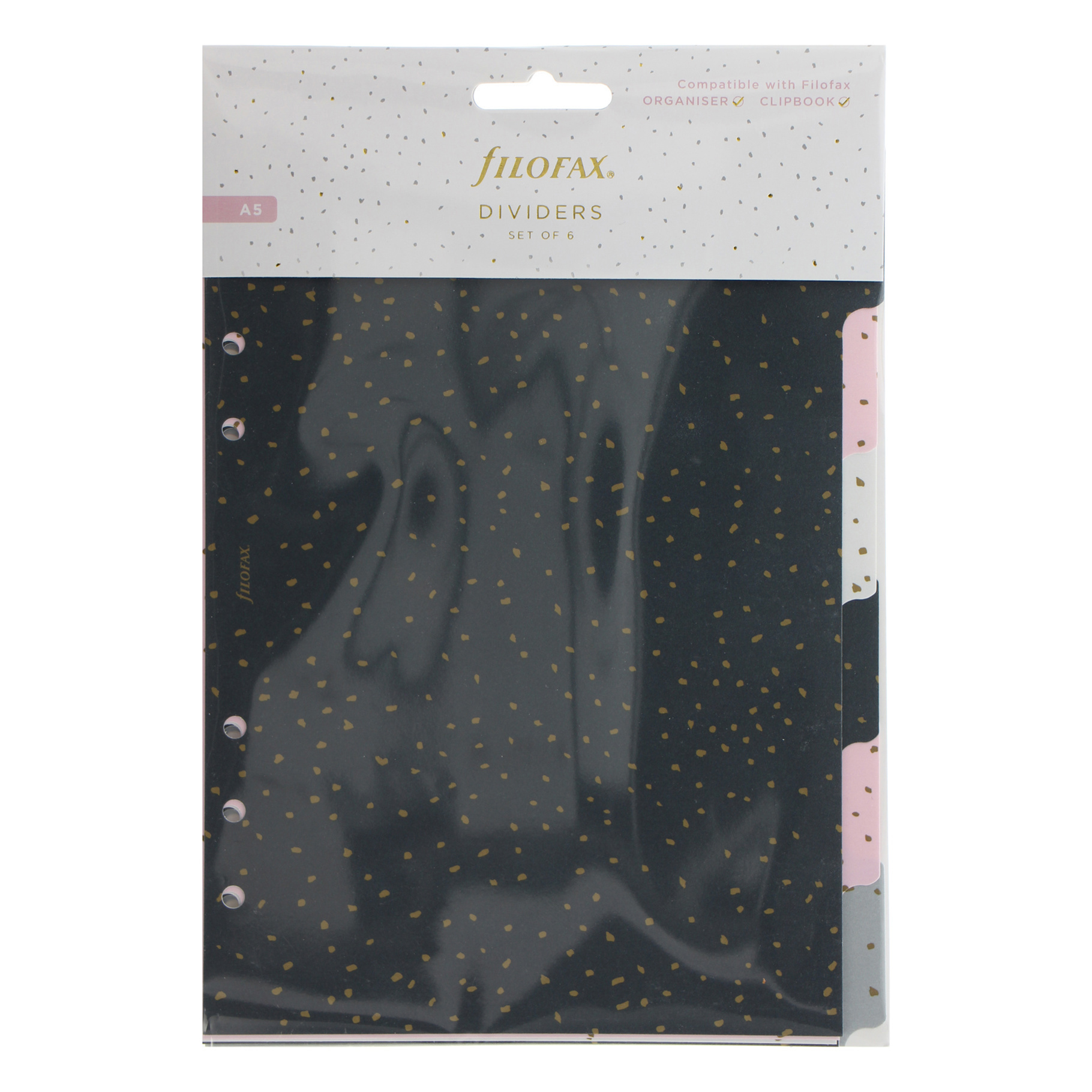 Dodejte svému diáři ještě více dokonalosti díky této barevné sadě šesti odolných plastových rozřazovačů z kolekce Confetti. Jsou speciálně navržené pro diáře Filofax nebo Clipbooky ve velikosti A5. V sadě najdete rozřazovače v černé, růžové, bílé a šedé barvě, a jsou potištěné z obou stran. Další vlastnosti 6 rozřazovačů s prázdnou záložkou