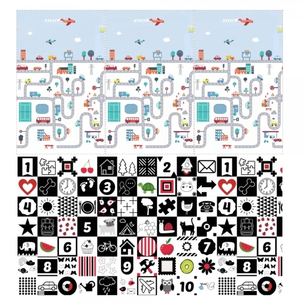 Táto podložka je navrhnutá tak, aby sprevádzala vaše deti od narodenia až do predškolského veku. Jej kvalitný materiál je úplne bezpečný - neobsahuje škodlivé látky ako formamid, ftaláty, PVC ani Bisfenol A. Obojstranný dizajn ponúka na jednej strane čierno-biele kontrastné obrázky, ktoré pomáhajú stimulovať zrak novorodencov, a na druhej strane čísla, ktoré podporujú učenie starších detí.