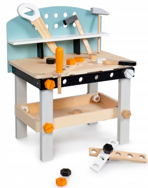 Dětský lékařský kufřík.Všechny nástroje a příslušenství jsou vyrobeny ze dřeva, pokryty bezpečnými barvami a bez ostrých, nebezpečných hran.Budoucí kutil má k dispozici:- pilku,- metr,- kladivko,- klíč,- šroubovák,- 12 šroubů,- 12 matek,- 3 podložky.Rozměry: 45 x 28 x 49 cm.Jakost.