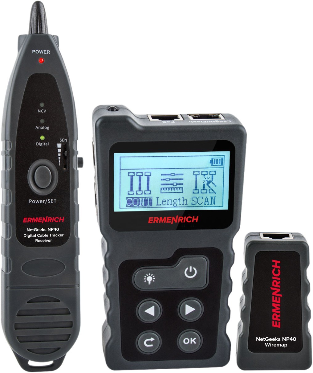 Tester pro sledování kabelů Ermenrich NetGeeks NP40Multifunkční přístroj Ermenrich NetGeeks NP40 je digitální tester kabelů, který je určen pro sledování kroucených dvojlinek a telefonních linek, zjišťování závad a chyb v instalaci vedení, měření délky kabelů a vzdálenosti k přerušeným obvodům...