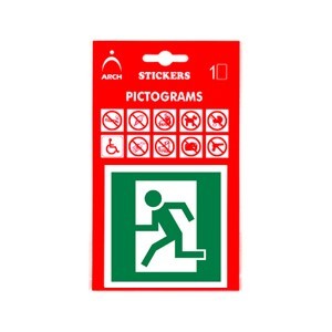 Informační samolepka v motivu únikového východu, kde je zobrazena lidská postava. Prodává se po jednom na blistru. prečítať celé