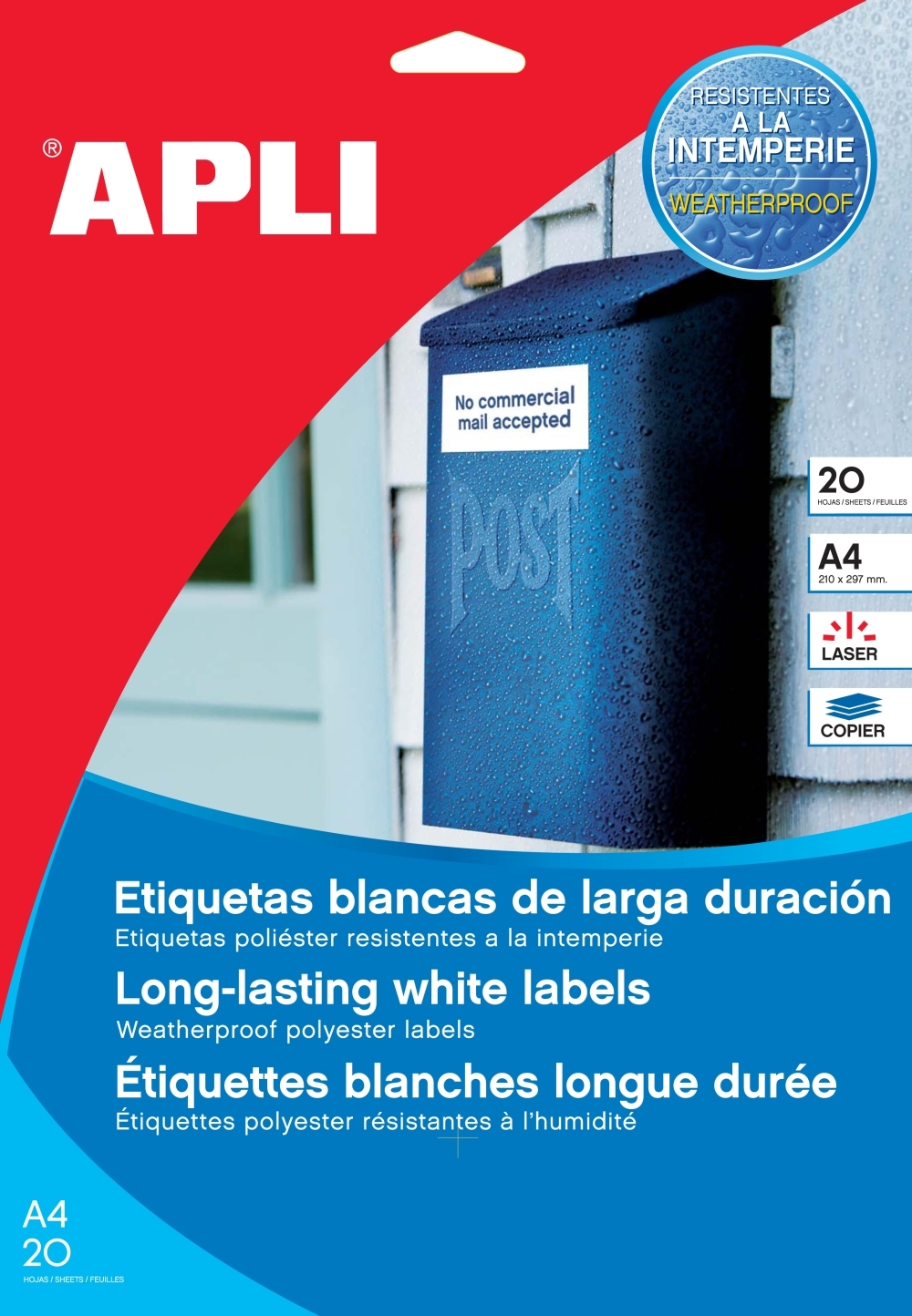 Bílé polyesterové etikety odolné vůči vnějším vlivům. Odolné v extrémních podmínkách teplot od -20 °C do + 100 °C. Ideální pro značení venkovních prvků a značek i balíků. Vhodné pro průmyslové použití, chemické laboratoře, stavebnictví aj. Etikety vysoké kvality pro laserové tiskárny a kopírky.