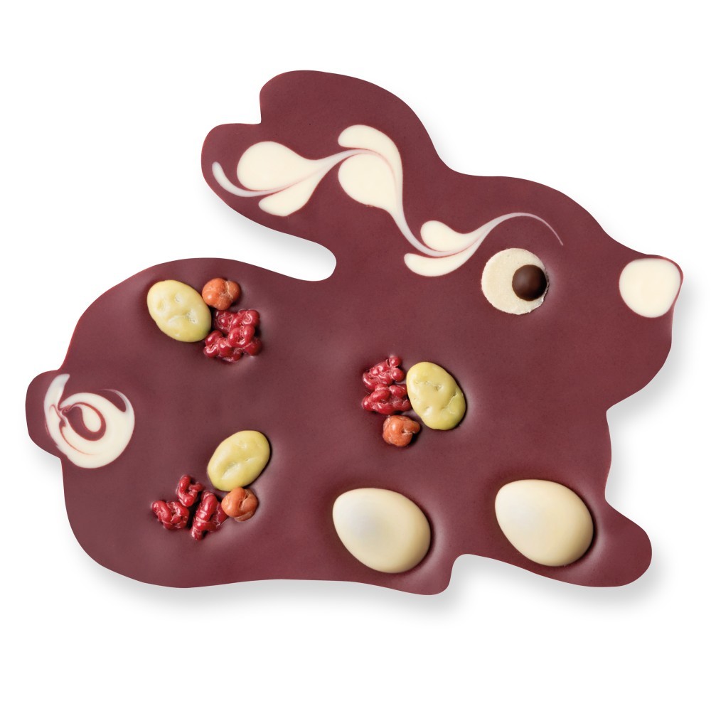 Roztomilý čokoládový zajíček z čokoládové polevy z černého rybízu zdobený dvěma bílými vajíčky v tlapičkách z kokosové čokolády. Výraz velikonočního zajíčka dotváří také vzor v ouškách z bílé kokosové polevy a marcipánová očka. Tělo je zdobené křupavými sušenými jahodami v čokoládě, praženými...