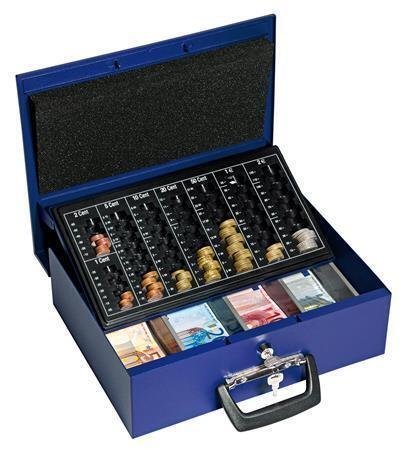Silná stabilní ocelová pokladna na mince i bankovky. Vlastnosti: pevná rukojeť; čtyřdílná vložka na bankovky; přihrádka na mince; bezpečnostní zámek a 2 klíče;...