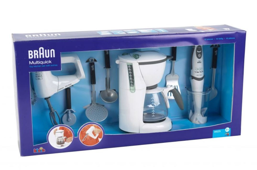 Mega zestaw kuchenny Braun W skład zestawu wchodzą: ekspres do kawy (na baterie), mikser (na baterie), blender (na baterie), dozownik, nóż do pizzy, łyżka do makaronu, chochla. Urządzenia wydają realistyczne dźwięki, do ekspresu można nalać wody. prečítať celé