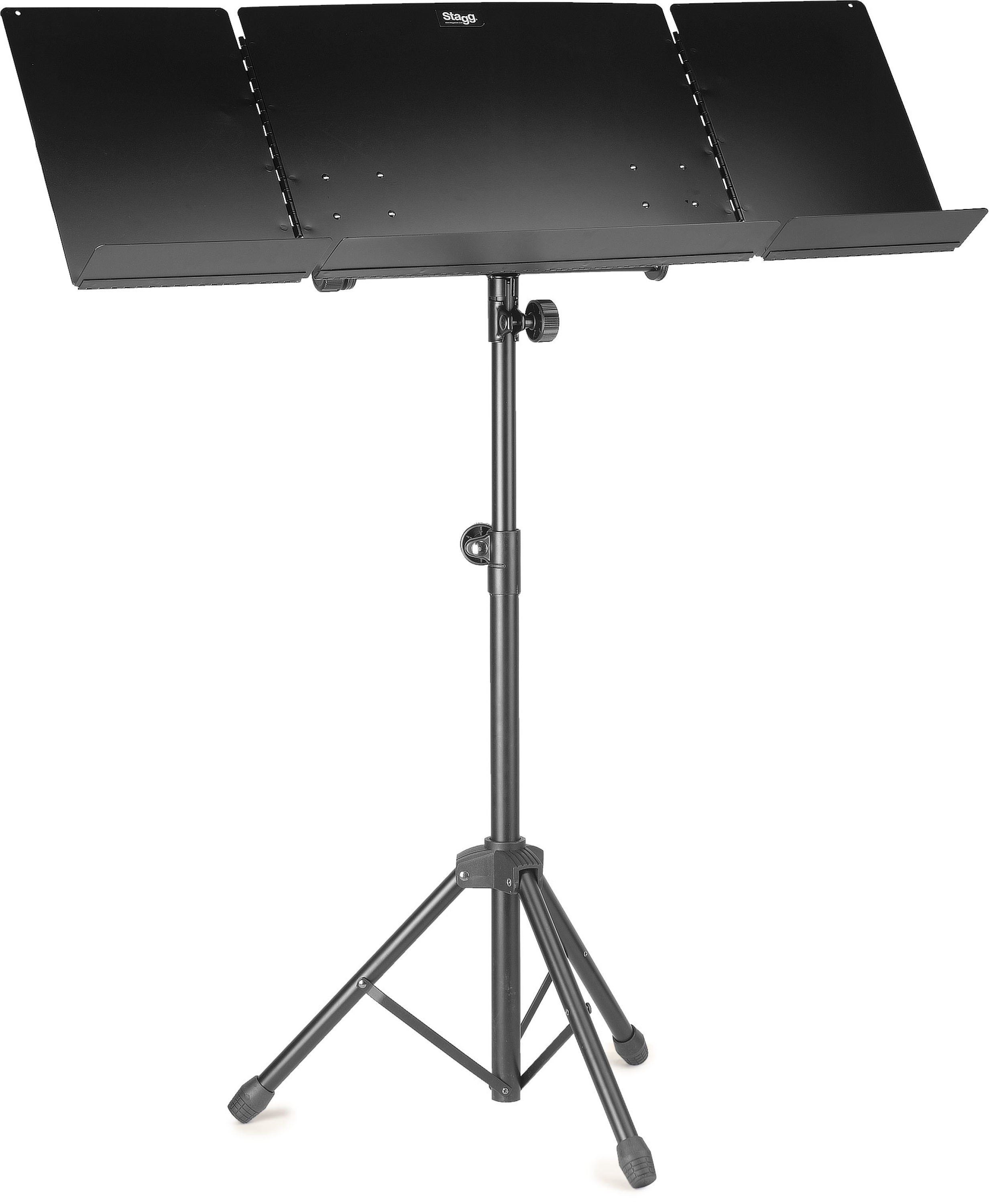 Stojánek na noty trubkové konstrukce, skládací, kovové šrouby, kovový rozkládací pultík 49 - 98 x 44 cm, výška 60 - 115 cm, hmotnost 5,8 kg. Barva černá.