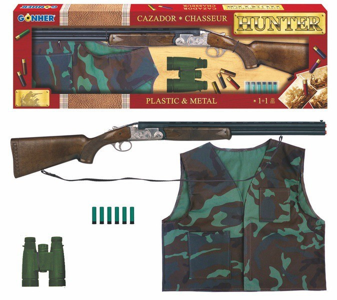 Zestaw dubeltówka z kamizelką Gonher Strzelba wykonana z tworzywa sztucznego (kolba i lufa) oraz metalu (część środkowa i mechanizm spustowy). W nabojach można umieścić kapiszony dla uzyskania lepszego efektu dźwiękowego. Dodatkowe naboje/łuski (nr kat.: 4117/0) oraz pojedyncze kapiszony (nr...