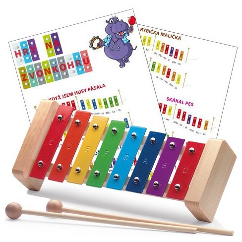 Metalofon s osmi barevnými kameny, ladění v rozsahu jedné oktávy C - C1, rám borovice. Rozměry 25,7 x 10,7cm, dodáváno vč. dvou dřevěných paliček. Bezpečnostní certifikace EN71 (Evropa), vhodné pro děti od 3 let.