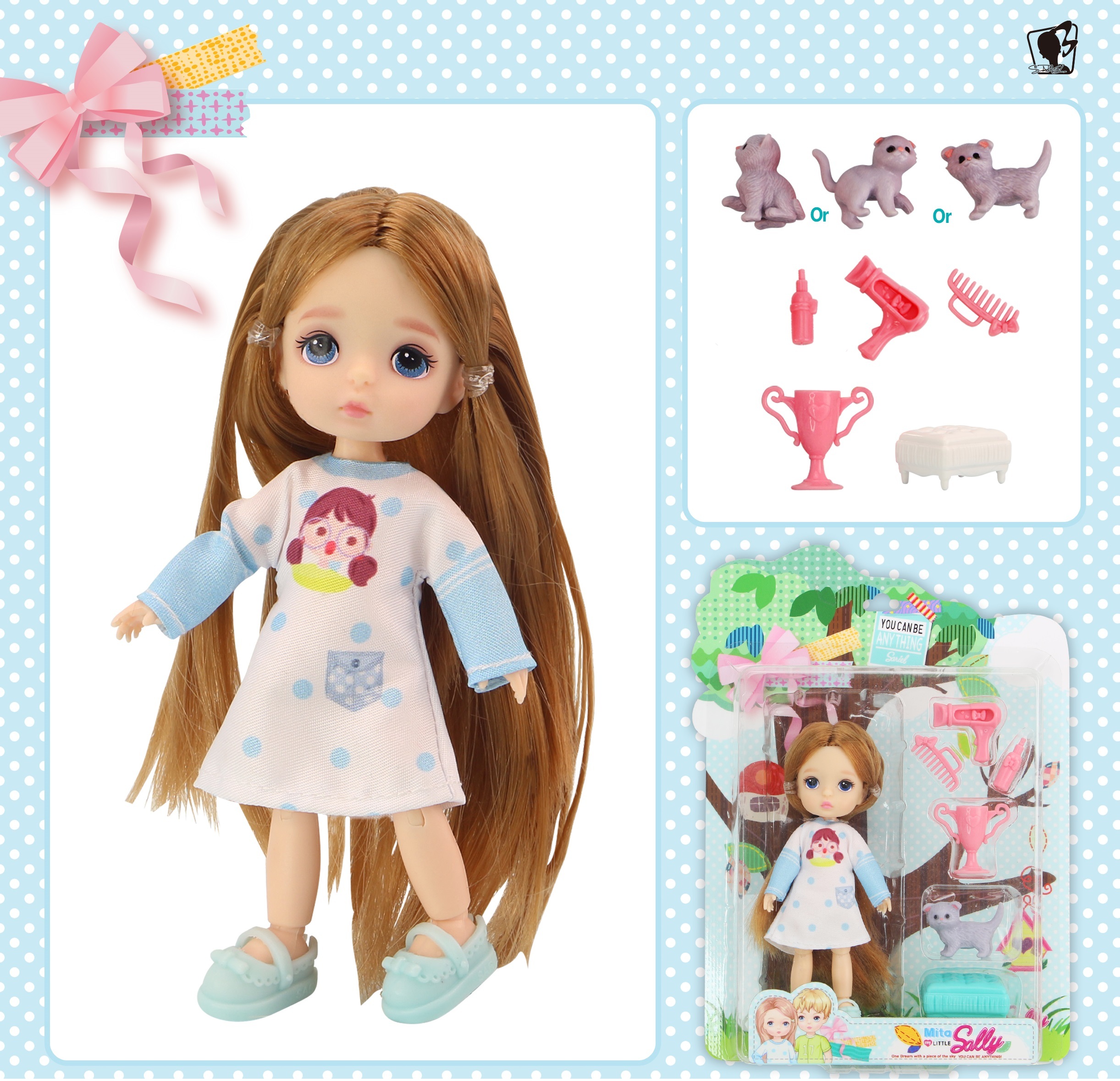 Panenka s kočkou set. Velikost 12,5 cm. Pohyblivé klouby. Obsah balení - panenka, figurka kočky, příslušenství. prečítať celé