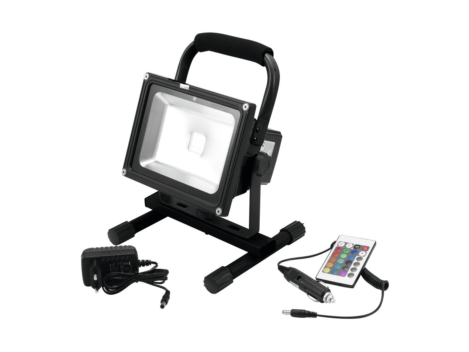 Výkonný venkovní reflektor je osazený 20W COB LED a vybavený dobíjecí baterií na 3 hodiny samostatného provozu. Možnost napájení světelného efektu ze sítě nebo automobilu (adaptery jsou součástí dodávky). Reflektor je vhodný pro použití v exteriéru (třída krytí IP 64). Vyzařovací úhel 63, RGB...