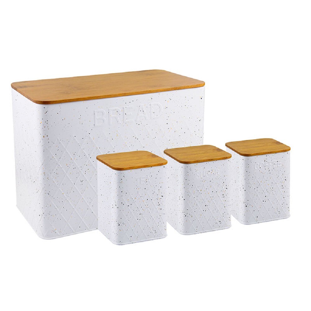 HOME ELEMENTS-HR Chlebník kovový+dózy na potraviny,kov s bamb. dřevem,barva bílá