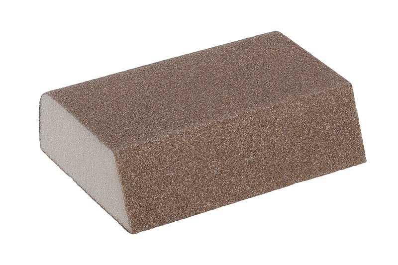brusná houba zkosená 45°, zaoblená molitanový základ, vhodné pro různé povrchy a materiály - broušení dřeva, kovů, sádrových omítek, tmelů apod. a to jak za sucha, tak i za mokra speciální tvar houby vhodný k renovaci nábyku, oken, dveří, broušení v hůře přístupných místech apod. rozměry - 100 x 70 x 25 mm