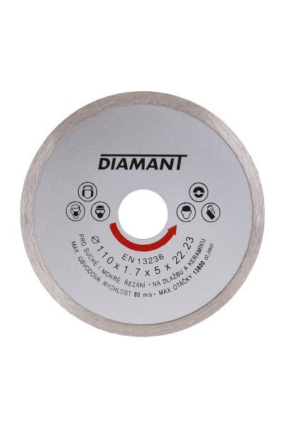 Diamantový kotouč DIAMANT, provedení: PLNÝ - celoobvodový, kvalitní diamantová vrstva s vysokým obsahem diamantového prachu, přesné zpracování - napojení na nosný disk kotouče odolávající vysokým teplotám, použití: určený pro mokré i suché řezání dlažby a obkladů, betonu, cihel, zdiva, žuly,...