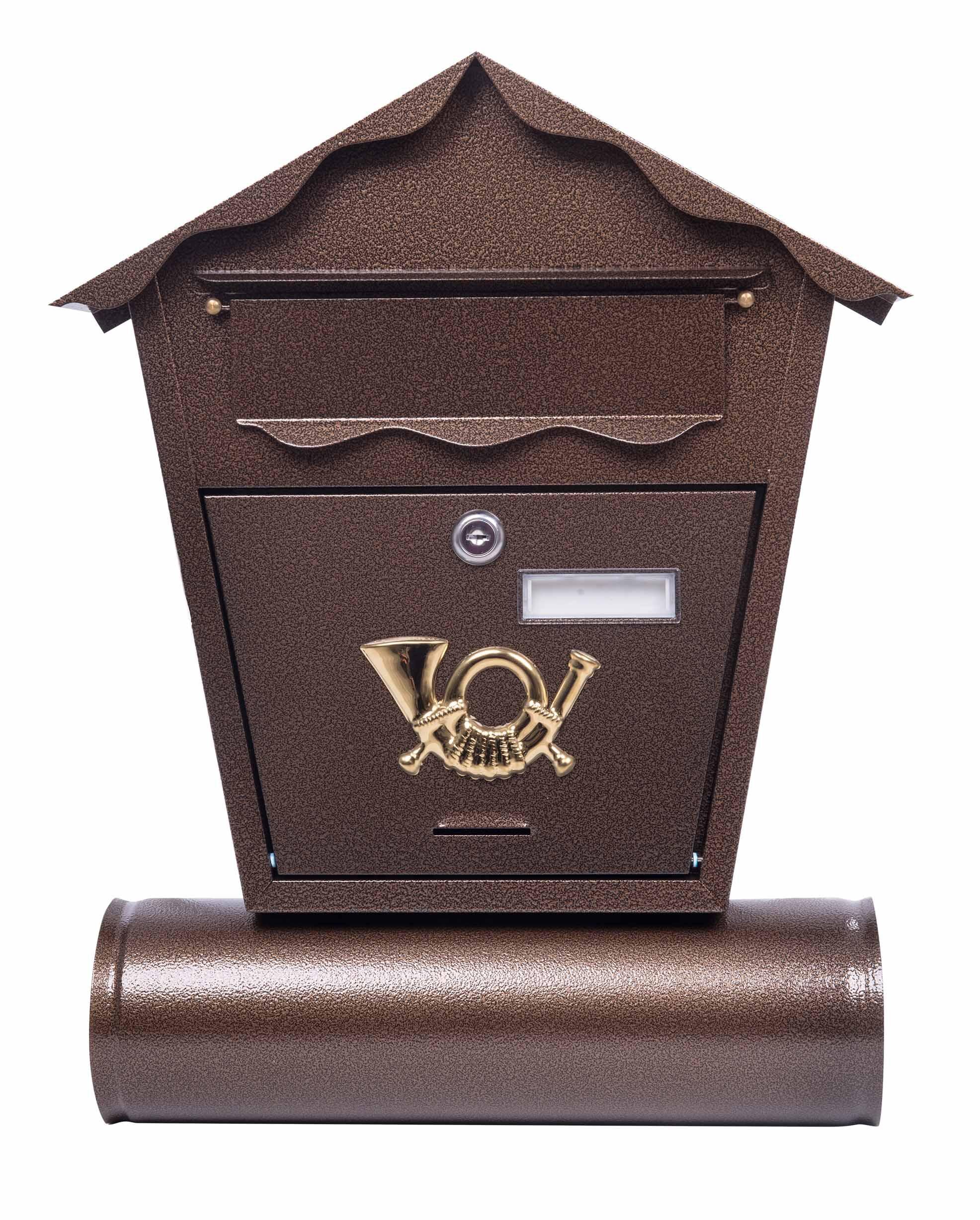 Poštovní schránka se špičatou stříškou Tradiční poštovní schránky vyrobená z oceli. Tubus na tiskoviny. Uchycení do zdi nebo na plot ve čtyřech bodech. Vhodná na vnitřní i venkovní použití.Technické parametry:- Barva: bronzová- Rozměry (šxvxh): 360 × 460 × 135 mm- Příslušenství: 2...