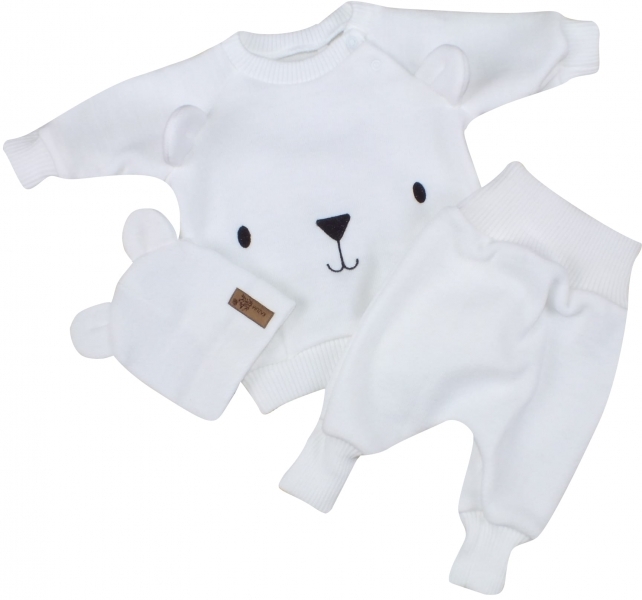 Pletená kojenecká sada 3D Medvídek, svetřík, tepláčky + čepička Kazum, bílá, vel. 68; 68 (3-6m)