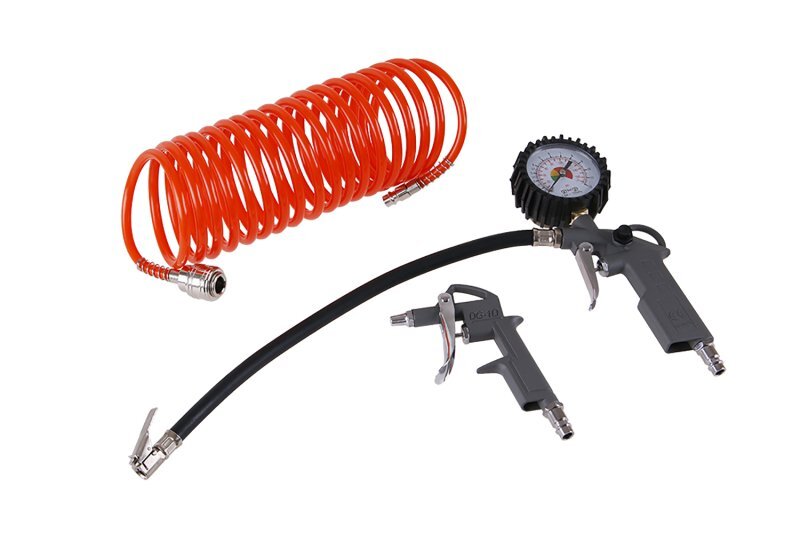 Kompresorová sada se skládá z pistole nafukovací s manometrem - pro snadné plnění stlačeným vzduchem (např.pneumatik automobilů, kol apod.), pistole ofukovací - pro vyfukování např. kovového prachu ze špatně přístupných míst, spirálová hadice 5m - pro připojení pneumatického nářadí ke kompresoru. Pracovní tlak 5barů - max. 8barů.