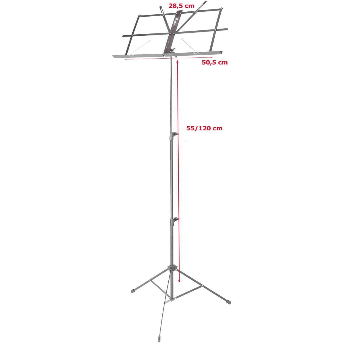 Notový skládací stojan, třídílná kovová konstrukce s nylonovými spojovacími částmi, pružinové držáky stránek, nastavitelná výška 50 - 112 cm, průměr trubek 8,5 mm, 11 mm, 14 mm, hmotnost 0,8 kg. Barva černá.