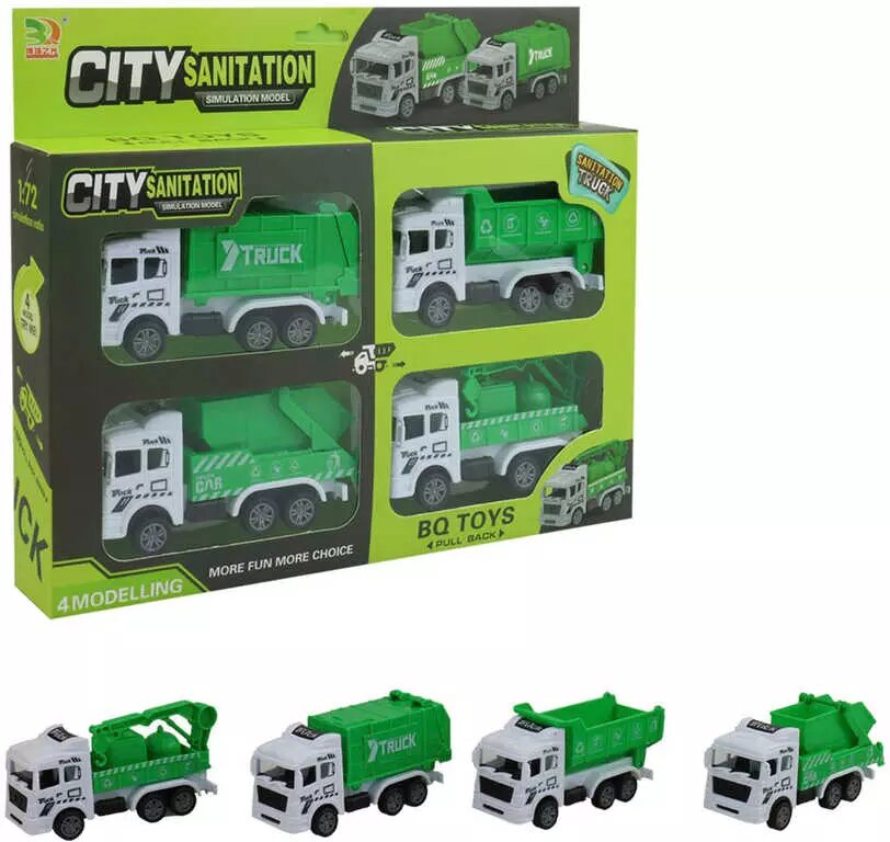 Sada čtyř různých vozidel technických služeb v bílozeleném designu (svoz komunálního / tříděného odpadu, sklápěčka, popeláři) z plastu, s pohonem na zpětné natažení prečítať celé