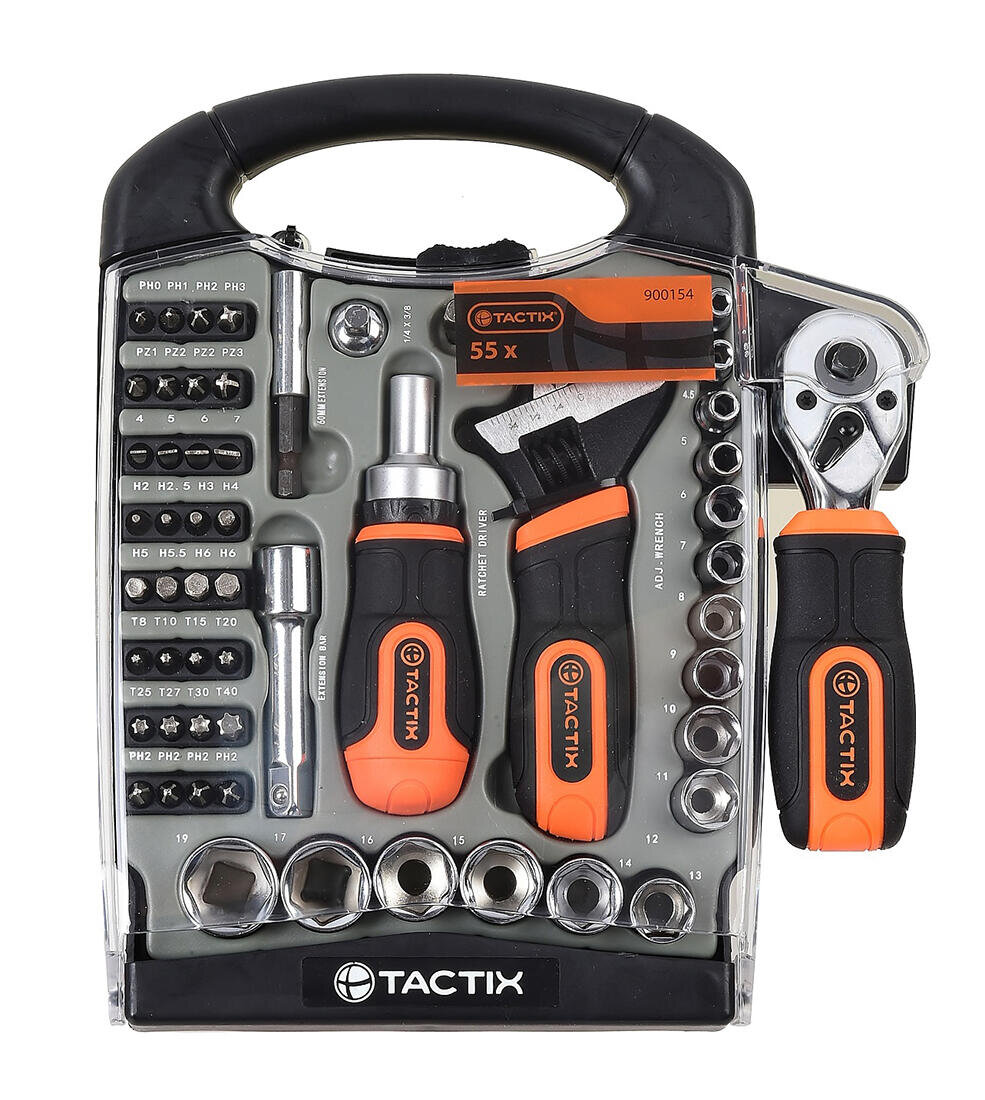 Nářadí sada 55díl. TACTIX.sada obsahuje:- 32 ks bitů Cr-V o průměru 25 mm (1"): PH#0, #1, #2 x 5, #3SL4, 5, 6, 7 mmHEX 2, 2,5, 3, 4, 5, 5,5, 6 x 2 mmPZ #1, #2 x 2, #3T-8, T-10, T-15, T-20, T-25, T-27, T-30, T-40- ráčna s dvojitou hlavou 1/4 a 3/8"- šroubovák s ráčnou- nastavitelný klíč- nástrčné...