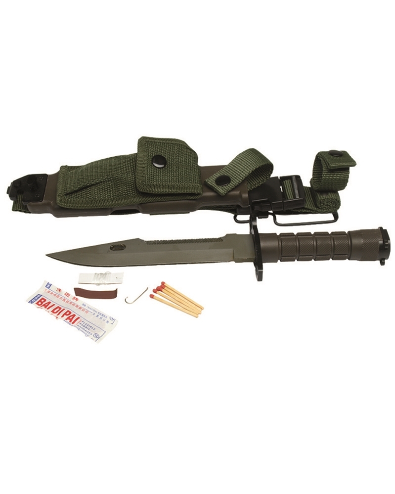 Pochva bajonetu je tvořena kombinovaně z plastu s kovovou špicí s možností upevnění jak k opasku tak i např. k noze.Součástí pochvy je praktická nylonová kapsička pro uložení potřebných doplňků (libovolně odnímatelná), ze zadní strany je pak umístěn brousek na nůž.Čepel je šedě zbarvena, vyrobena z kvalitní uhlíkové oceli se specielně vybroušenou pilkou se šikmými zuby na hřbetě, které jsou schopny rozrušit mnoho různých houževnatých materiálů. Bajonet ...