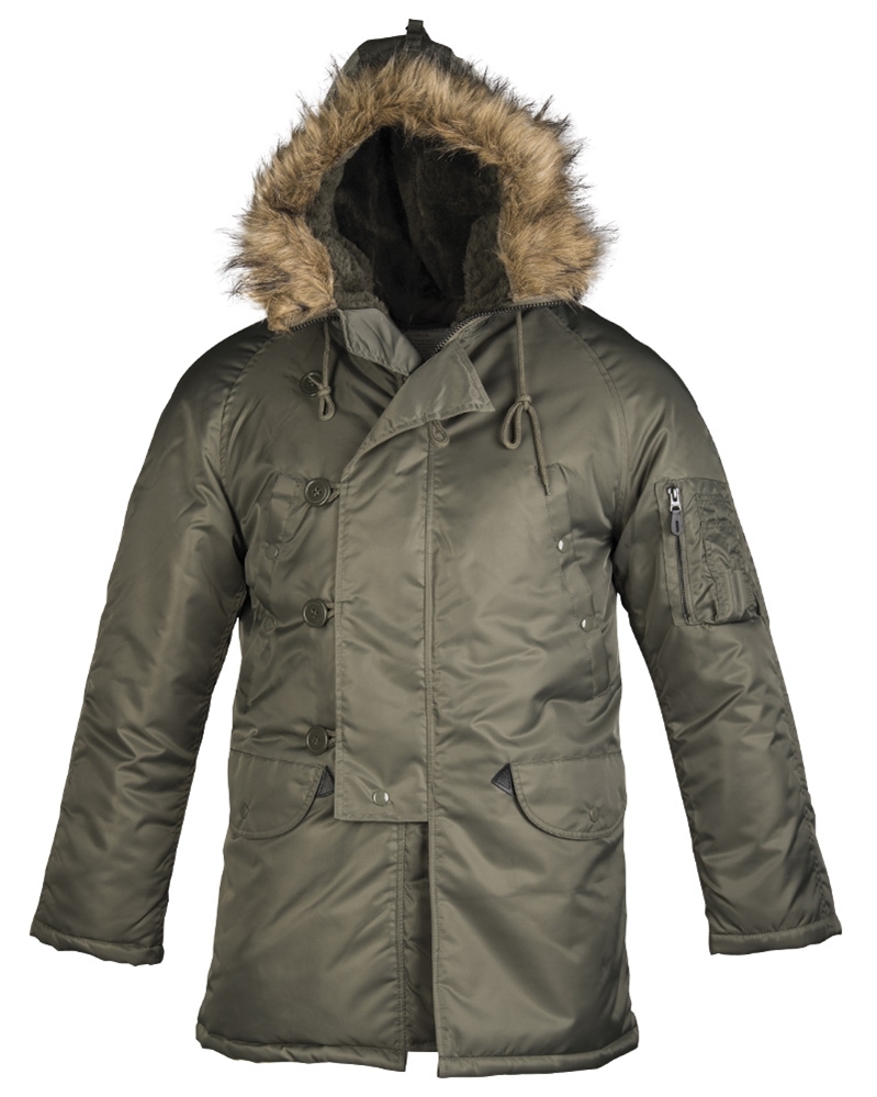 Parka s vynikající tepelnou izolací, díky vatové výplni a použitému materiálu.Tento typ bundy je delší než N2B.Vlastnosti:• nepromokavá• okraj kapuce opatřen umělou srstí pro ochranu obličeje před větrem• kapuce stažitelná tkanicí• 2 kapsy na bocích• 2 kapsy na hrudi• 1 kapsa na levém rukávuMateriál:svrchní: 100 % polyamid (nylon)podšívka: 100 % polyamid (nylon)vatová výplň: 100 % polyesterumělá srst: 100 % akryl
