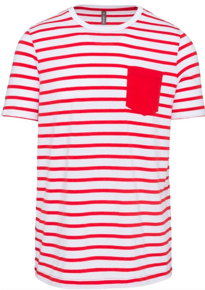 Pánské námořnické tričko s pruhy a kapsičkou na hrudi. Materiál single jersey hladký úplet, česaná bavlna velmi jemná na dotek. Vlastnosti: • kontrastní náprsní kapsa na levé straně • žebrový náplet u krku • kontrastní vnitřní lemovka za krkem • dvojitý kontrastní šev na lemu rukávu a spodním okraji