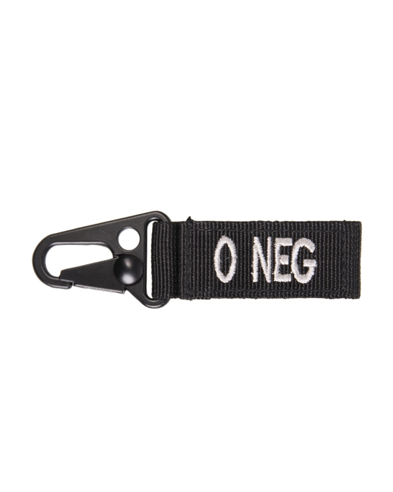 Karabina od německé značky Mil-Tec s označením krevní skupiny - označení je vyšito na MOLLE pásku se zapínáním na suchý zip. Viditelně připevnit k oděvu nebo vybavení - poskytuje záchranné informace v případě nouze. Tyto karabiny nejsou určeny pro horolezectví a jiné sporty, kde by tato karabina měla sloužit k vysokému zatížení.