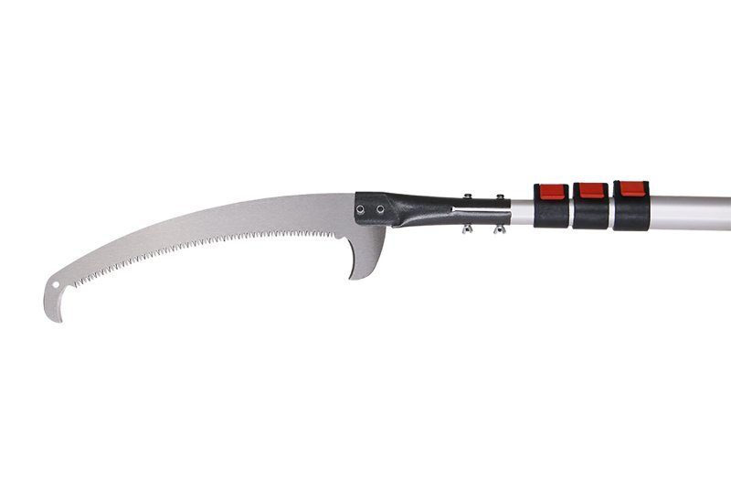 teleskopická prořezávací pila 230 - 490 cm 3x broušené a kalené zuby - snadný a čistý řez, dlouhá životnost délka pilky 340 mm, pilka je zakončená háčkem pro stržení odřezaných větví, na spodní straně pilky je vyčnívající ostrá čepel pro snadné odřezání tenkých větviček vhodné použití na prořezávání větví v korunách stromů ochranný plastový kryt na pilku