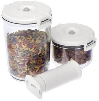 Materiál: je potravinám nezávadný, použit je vysokokvalitní polykarbonát (stejný materiál se používá na výrobu oken v letadlech, tzv. umělé sklo). Těsnění a ventil jsou vyrobené ze silikonu a zbytek z ABS plastu, který zajišťuje dlouhou životnost Set obsahuje: 0.75l a 1.5l oválné nádoby, odkapávací mřížky a vakuovou ruční pumpu Barva: bílá