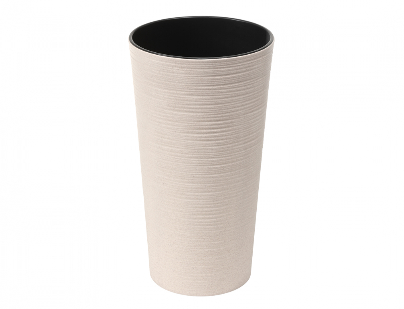 Tento vysoký plastový obal disponuje vnútornou vložkou, ktorá uľahčuje manipuláciu a chráni kvety. Je vyrobený z ekologického materiálu - recyklovaného plastu s až 40 % podielom drevených triesok, čo ovplyvňuje jeho príjemnú bielu farbu. Vďaka UV ochrane je vhodný nielen na použitie v interiéri, ale aj vonku, kde odoláva slnečnému žiareniu a nestráca svoj vzhľad.