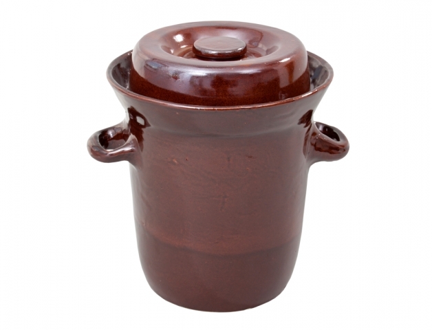 Keramický glazovaný hnědý lesklý 23l zelák s víkem. Zelák má téměř tvar válce, který se u hrdla rozevírá, aby se dal pohodlně zavřít víkem. Pod hrdlem jsou kvůli lepší manipulaci přidělaná keramická ucha. Zelák se používá ke kvašení a skladování zelí a pro jinou podobně zpracovanou zeleninu....