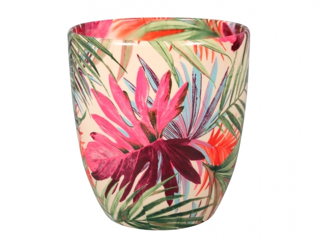 Tento keramický obal je ideálny pre všetkých milovníkov kvetín, ktorí chcú svoj interiér ozvláštniť štýlovým a funkčným doplnkom. Kombinácia lesklého povrchu a jemného vzoru paliem robí z tohto obalu krásny dekoračný prvok, ktorý si zamilujete.