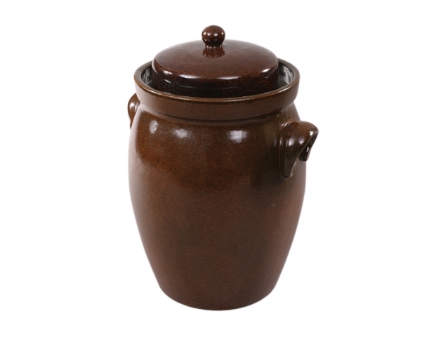 Keramický glazovaný hnědý lesklý 10l zelák s víkem a s uchy. Zelák je v půdorysu kruhový. Tvar má kónický, kdy se v horní části, kde jsou připevněná keramická ucha začne opět uzavírat. Horní ohraj je poté kolmý rovný pruh. Na něm je položené víko. Zelák se používá ke kvašení a skladování zelí a...
