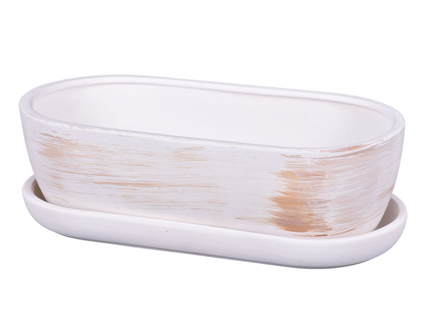 Matný keramický truhlík s podmiskou. Je vyroben ze speciálního bílého jílu s vysokým obsahem kaolínu. Barva: zatíraná bílá. Šířka: 34 cm, výška: 11 cm. prečítať celé