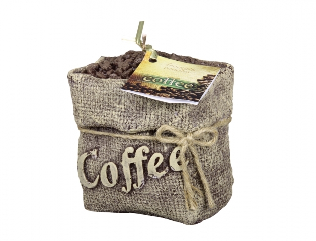 Zdobená svíčka ve tvaru pytle s kávou, nápisem Coffee a zrnky kávy. Svíčka je ovázaná provázkem. Rozměr: 8 x 11 x 11 cm. prečítať celé
