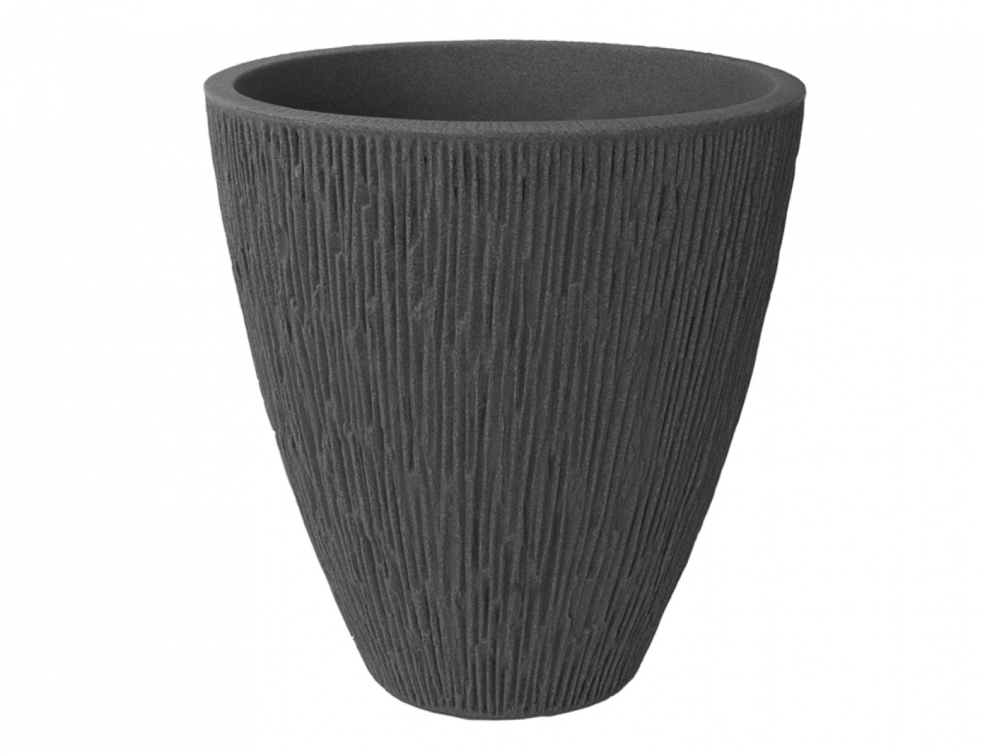 Plastový obal na květník v matném provedení. Vyroben z polyethylenu, rotační metodou. Je odolný vůči mrazu i UV záření, tudíž se hodí nejen do interiéru ale i exteriéru. Kruhového půdorysu, kónického tvaru. Povrch obalu strukturou i barvou připomíná lávu. Rozměry: průměr 40 cm, výška 42 cm. Barva: antracit.