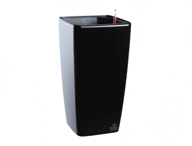 Půvabný elegantní designový hranatý jemně kónický černý lesklý obal pro květiny. S plastovou vložkou, ta je uvnitř květináče podepřená plastovým tubusem. Se samozavlažovacím systémem Flower Lower, který je technicky uzpůsoben tak, aby vyhovoval většině rostlin. Zavlažovací systém se skládá z roštu a z měrky hladiny vody. Rošt lze pohodlně vyndat, pomocí vytahovacích úchytů v rozích. Rozměry obalu jsou 18 x 18 x 34 cm výška.