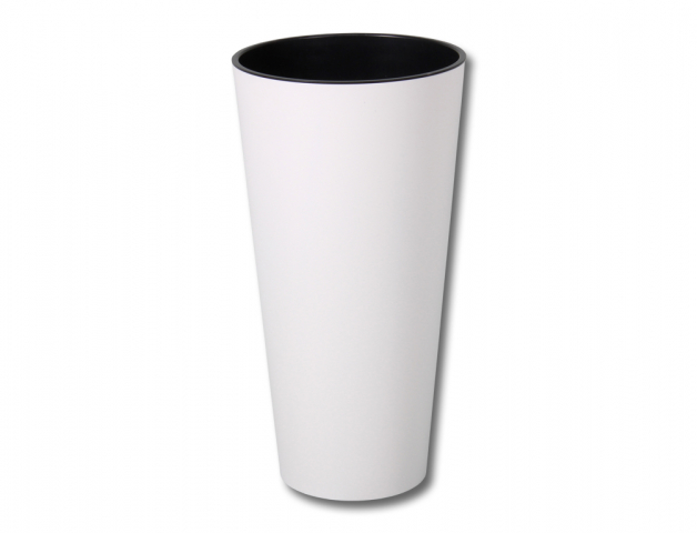 Plastový matný bílý vysoký obal s černou vložkou určený pro květináče s rostlinami vhodnými do interiéru. Průměr obalu je 40 cm a výška 76 cm. prečítať celé