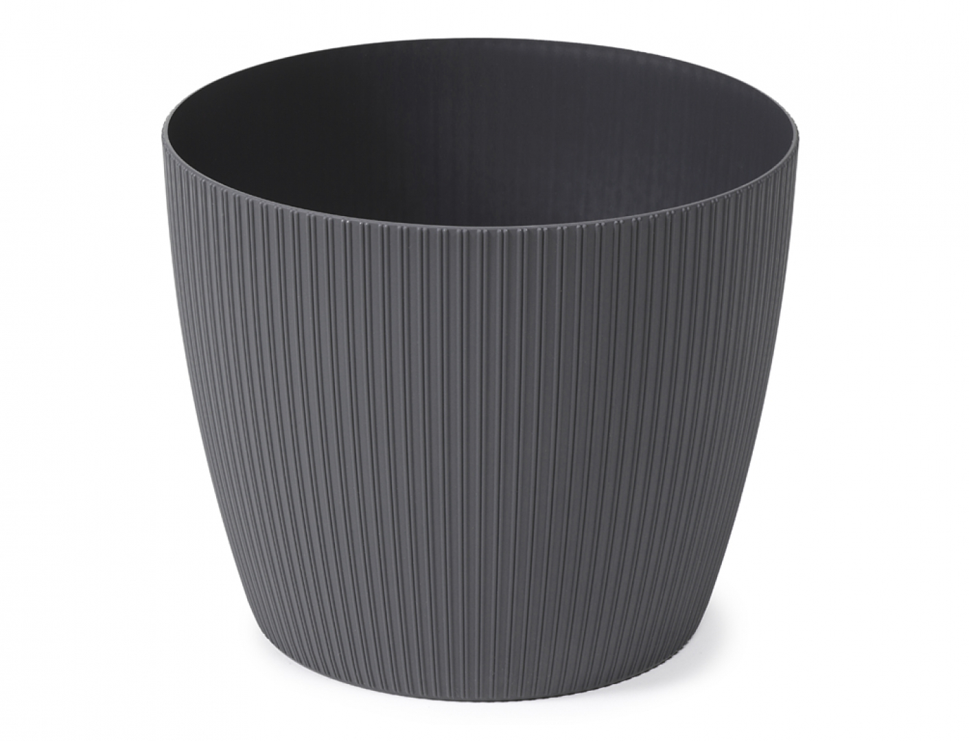 Plastový, matný obal na květináč v oblíbeném dekoru svislých pruhů, které připomínají pletený svetr. Vedle toho, že je bezesporu dekorativní je také šetrný k životnímu prostředí, protože je 100% vyroben z recyklovaného plastu. Barva se zejména u světlých odstínů může drobně lišit vzhledem k vlastnostem recyklátu. Rozměry: průměr 19 cm, výška 15 cm. Barva: antracitová.