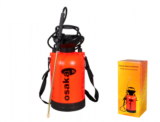 Kuželovitý plastový oranžový tlakový ramenný rozprašovač s černou rozprašovací částí, která má mosaznou trysku. Na rameno se dá zavěsit pomocí černého popruhu. Rozprašovač je o objemu 5000ml, s rozměry: d. 18 x š. 38 x v. 43,2cm. Používá se k rosení, k hnojení postřikem na list a také k aplikaci chemických postřiků v exteriéru.