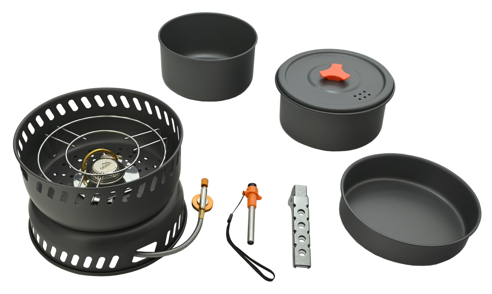 Nádobí s vařičem TREK sada 9ks s příslušenstvímSada nádobí a outdoorového vařiče na propan-butan, pro ohřívání a přípravu pokrmů na cestách, v kempu apod.Sada vařiče se skládá z několika dílu s rozlišným určením. Základna s rozměry 20 x 6,5 cm, na ní nasazené závětří 19 x 8 cm a vložený rošt. Na...