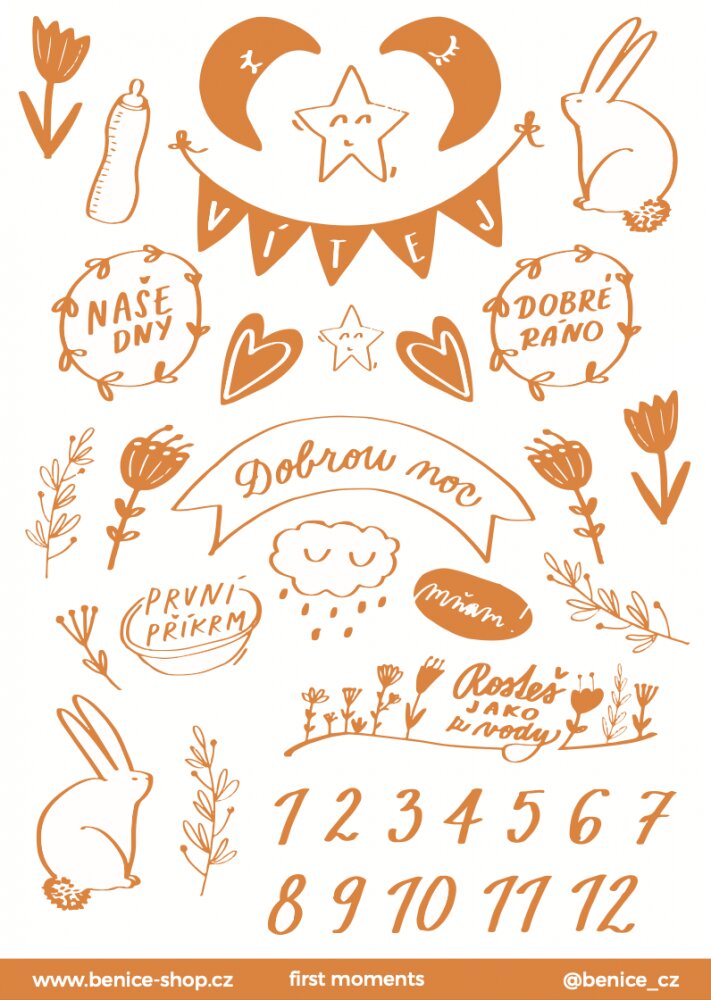 Obsahuje:1 arch samolepekRozměr: cca 12 x 17 cmOriginální autorský designSamolepky ilustrovala česká výtvarnice Bára z Nikolajky. Motivy na samolepkách jsou inspirované krásným obdobím malého miminka - lahvičky, příkrm, měsíce, a další motivy. Design výrobků Be Nice vytváříme delší dobu a než se...