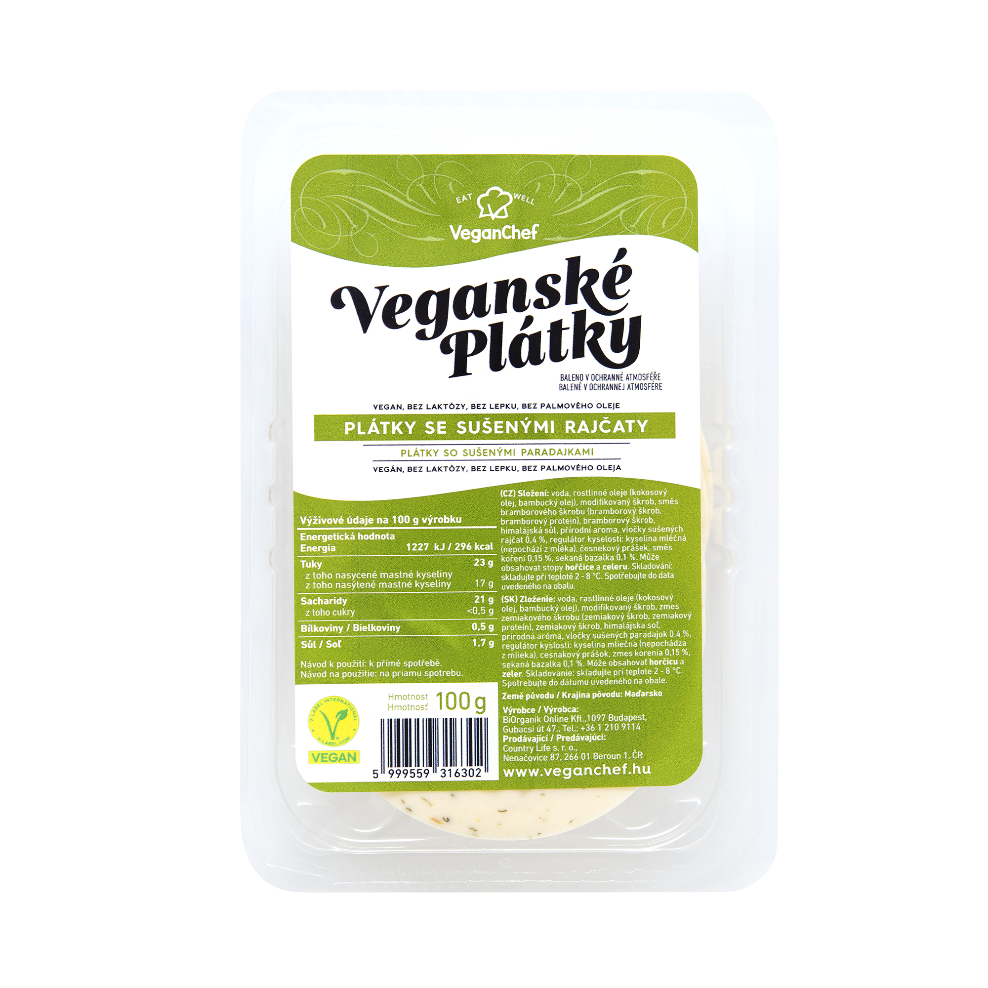 Voda, rostlinné oleje (kokosový olej, bambucký olej), modifikovaný škrob, směs bramborového škrobu (bramborový škrob, bramborový protein), bramborový škrob, himalájská sůl, přírodní aroma, vločky sušených rajčat 0,4 %, regulátor kyselosti: kyselina mléčná (nepochází z mléka), česnekový prášek,...